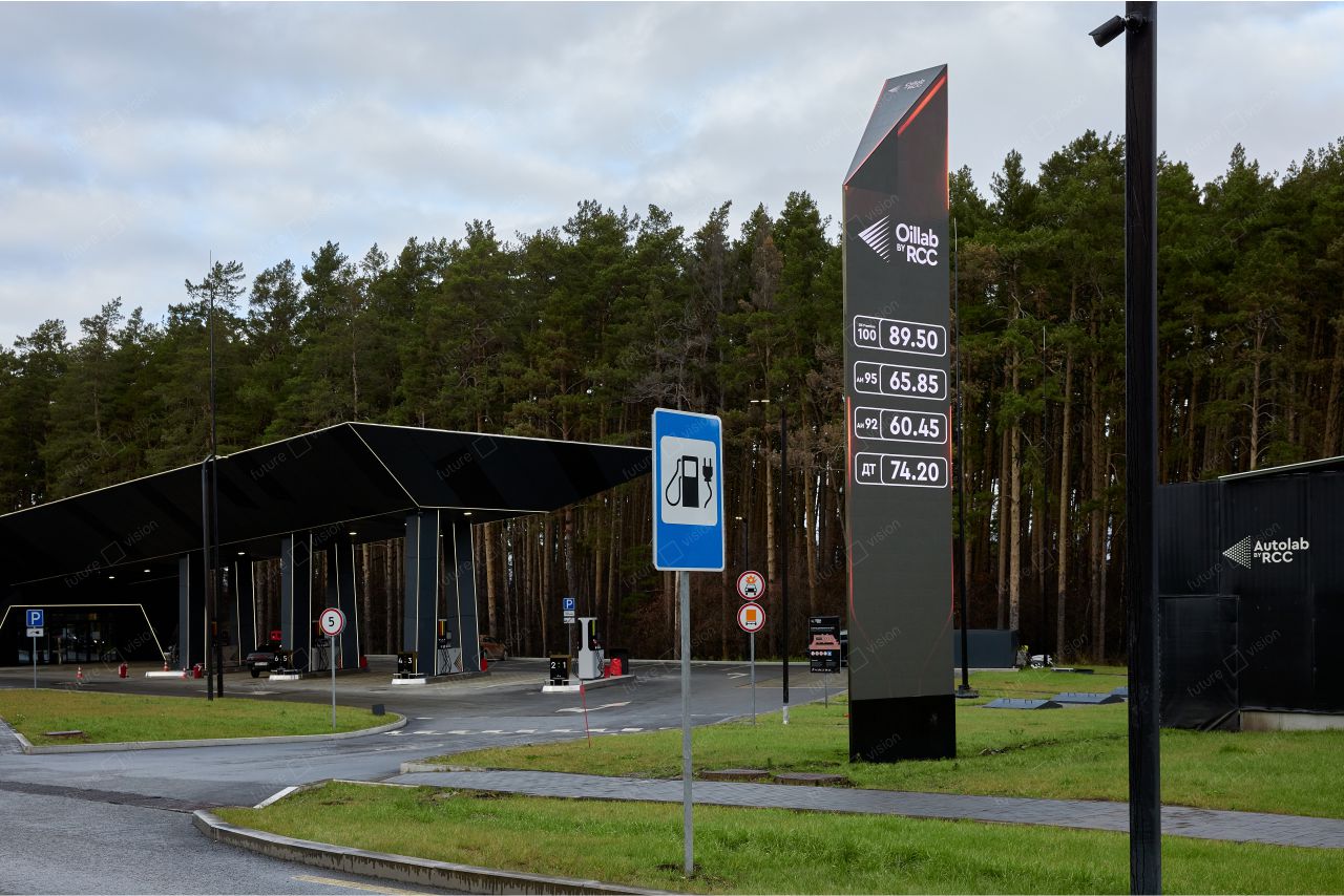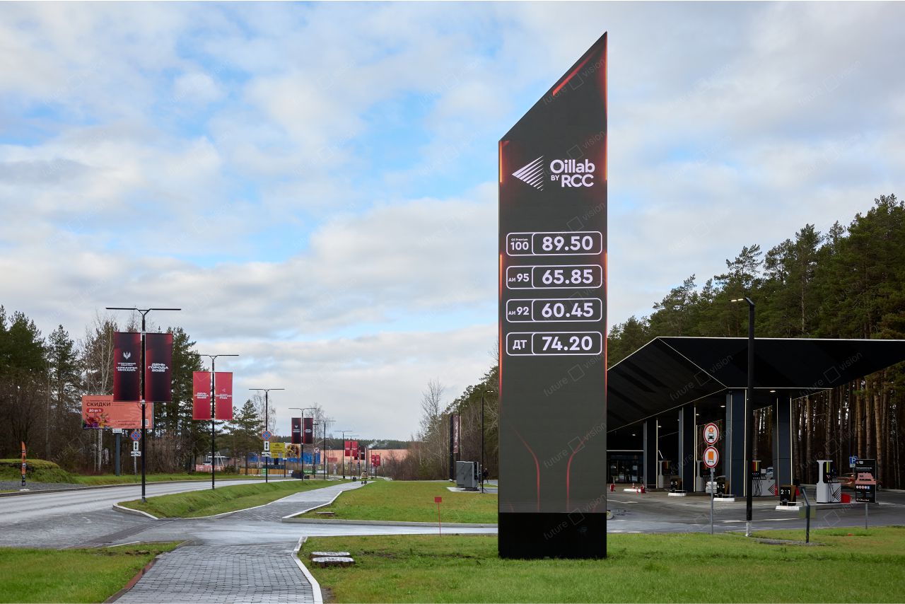 Завод Future Vision реализовал комплексное решение по разработке, изготовлению и установке светодиодных экранов для современной АЗС OilLab by RCC в городе Екатеринбург. Один экран установлен на подъезде к АЗС, второй — внутри помещения кафе.