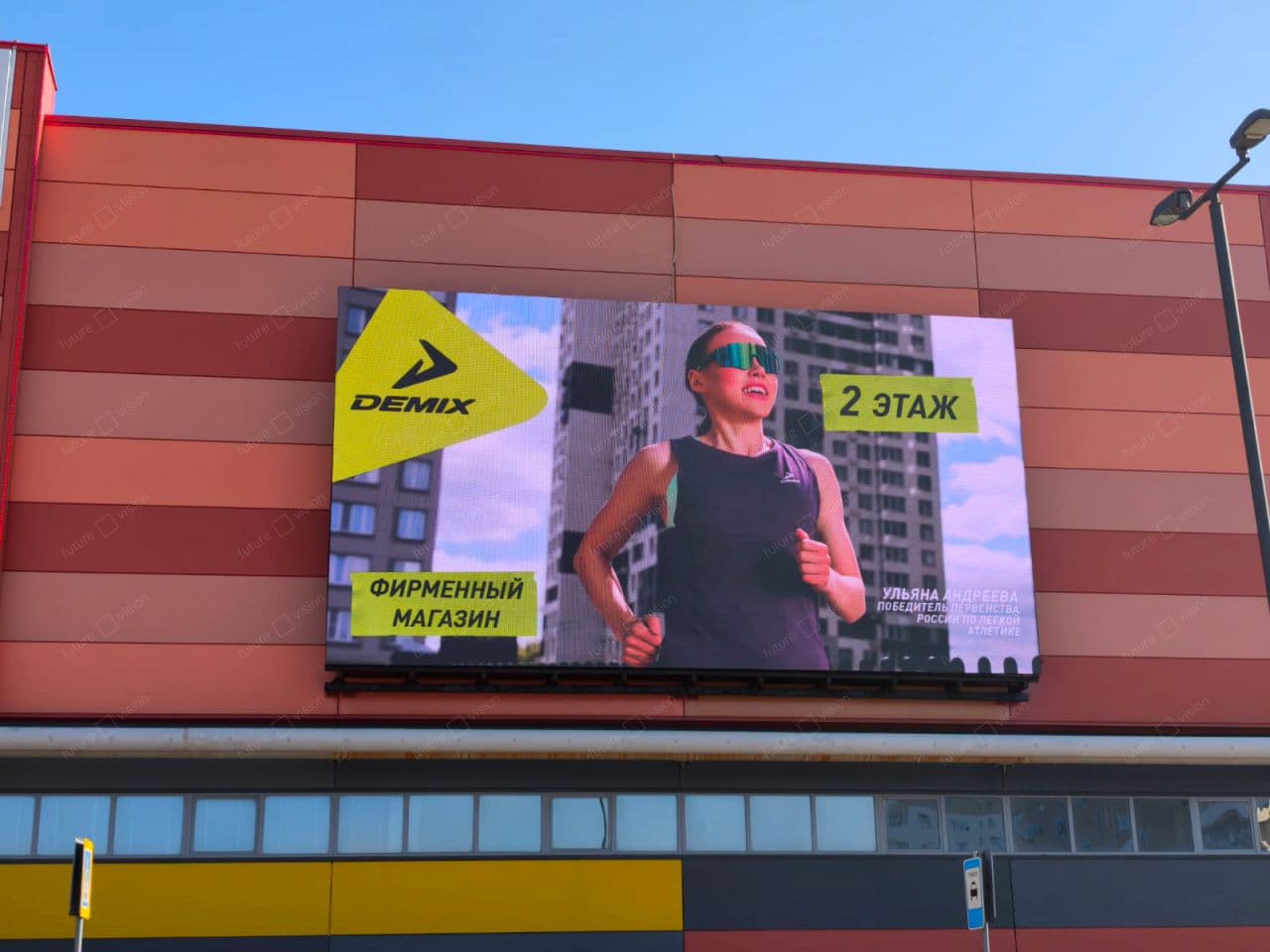Уличный экран, установленный на фасаде здания, транслирует рекламные ролики, тем самым привлекая максимальное внимание пешеходов и водителей вблизи торгового центра. Современный LED экран с шагом Р8 адаптирован к любым погодным условиям, и благодаря повышенной яркости публикуемый контент видно в ясную погоду, в туман, а также с дальнего расстояния.