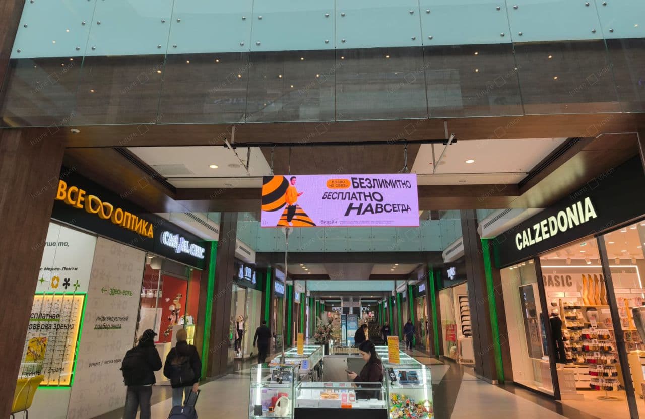Два внутренних светодиодных экрана с шагом Р2.5 выполняют рекламную функцию и уведомляют об акциях и другой полезной информации от арендаторов торгового центра. Внутренние LED экраны установлены подвесным способом, с фронтальным методом обслуживания.